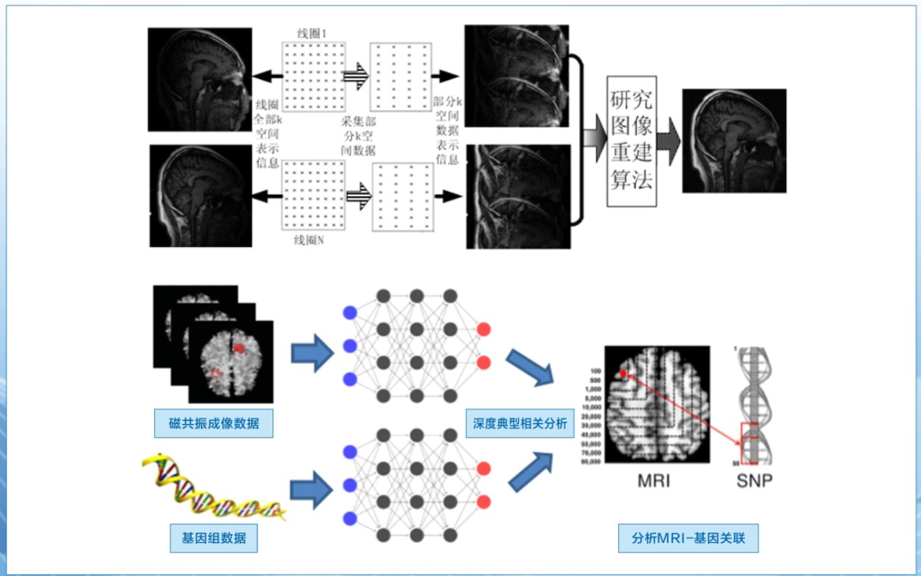构造出具有方向性的八领域小框架系统,提取图像八领域每个方向的图像特征,具有更少的计算复杂度,应用于pMRI重建算法。基于磁共振成像数据和基因组学数据,建立深度典型相关分析模型,分析MRI数据与基因组数据之间的关联,推断出与疾病发生发展密切相关的变化。